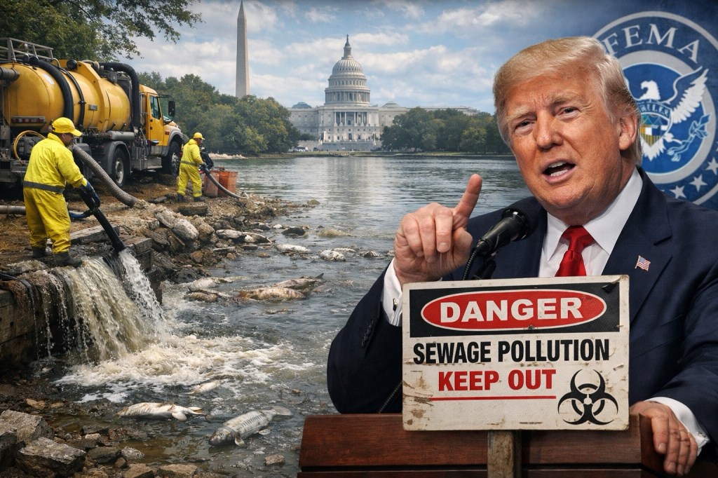 Washington, D.C. — President Donald Trump says the federal government is prepared to step in through FEMA to assist with cleanup and mitigation efforts stemming from the catastrophic rupture of the Potomac Interceptor sewer line — a failure that has already released hundreds of millions of gallons of untreated wastewater into the Potomac River corridor.